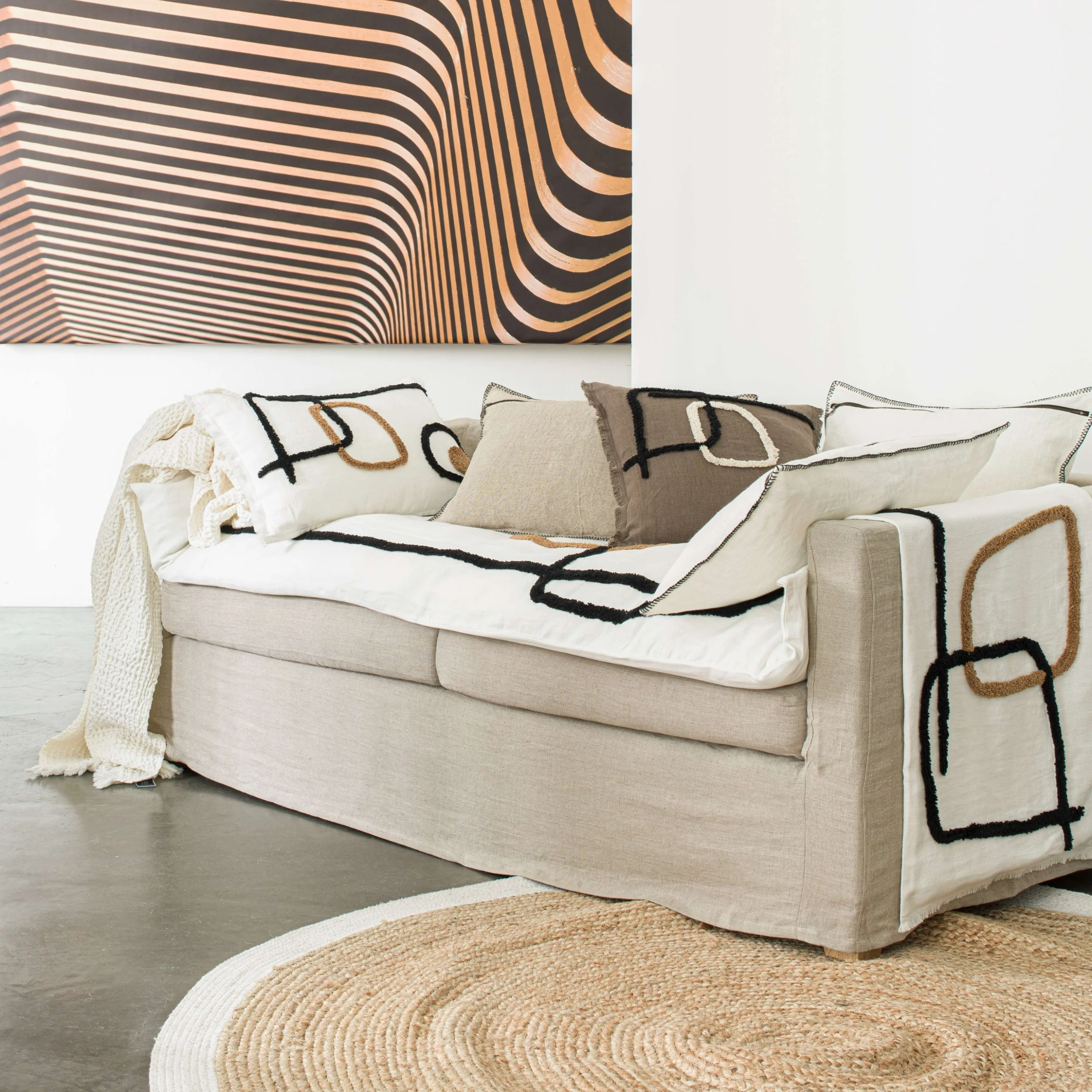 1 Face 100% lin : 380 gr/m² , 1 Face 100% coton : 240 gr/m² , Fermeture zipper – DĂ©tail Franges , Broderie TuftĂ©
